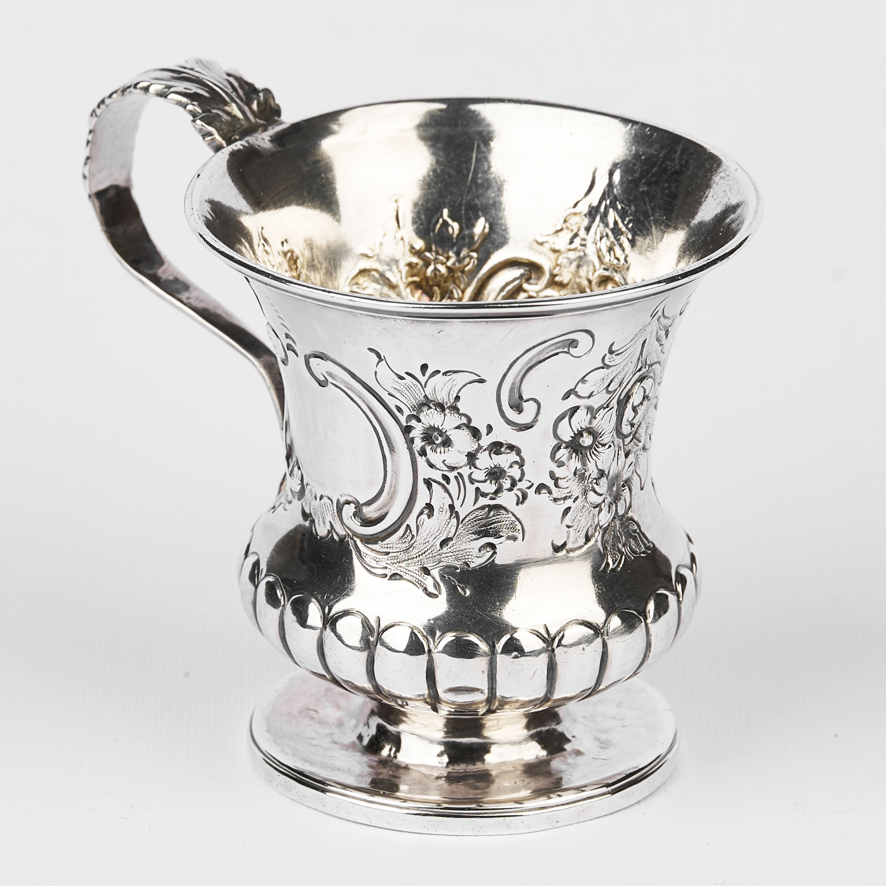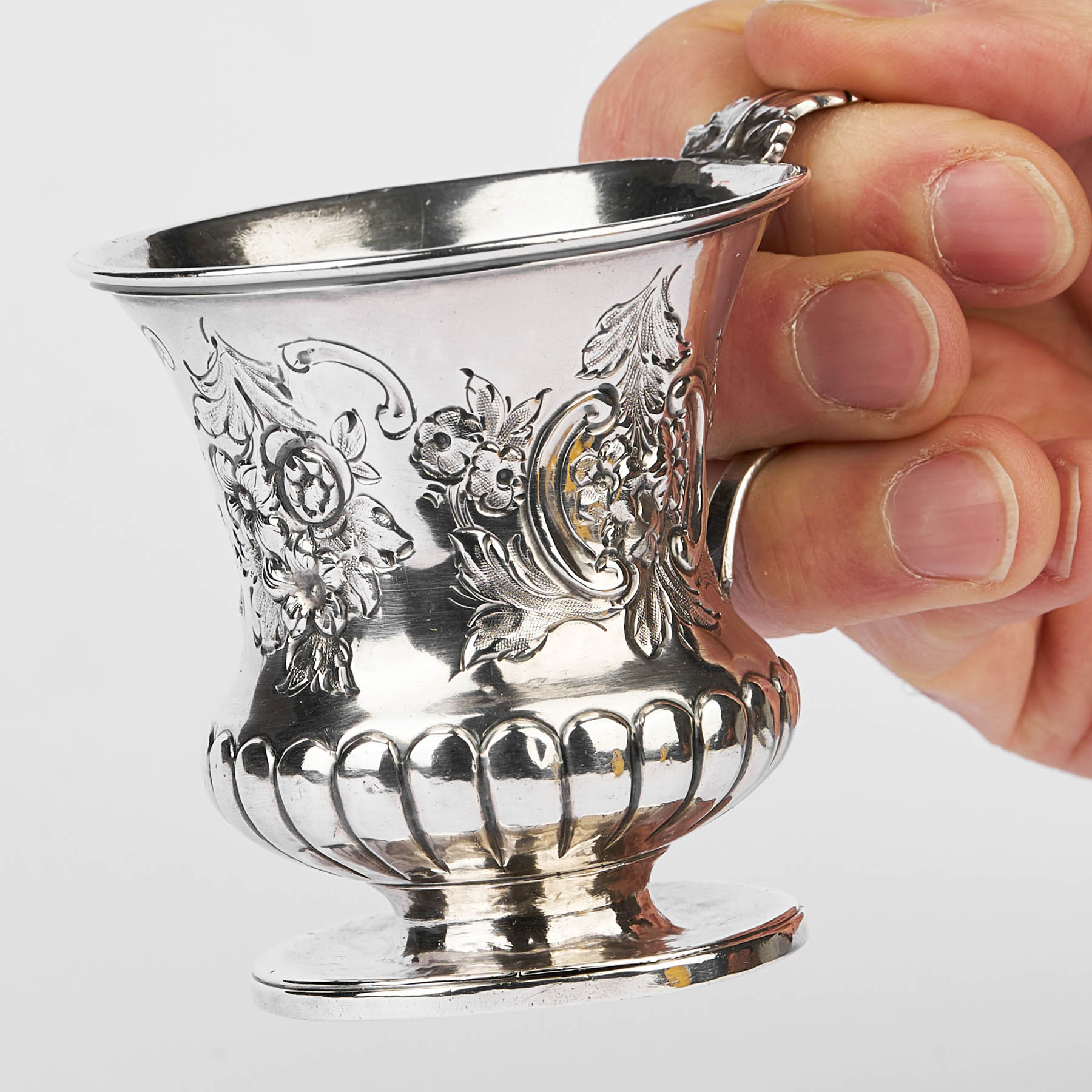Interiorul păstrează aurire parțială (vermeil), un detaliu nu doar decorativ, ci și funcțional, menit inițial să protejeze argintul de contactul cu lichidele. Toarta grațios curbată, solidă și bine proporționată, este atent finisată, oferind o prindere confortabilă și completând linia elegantă a piesei.