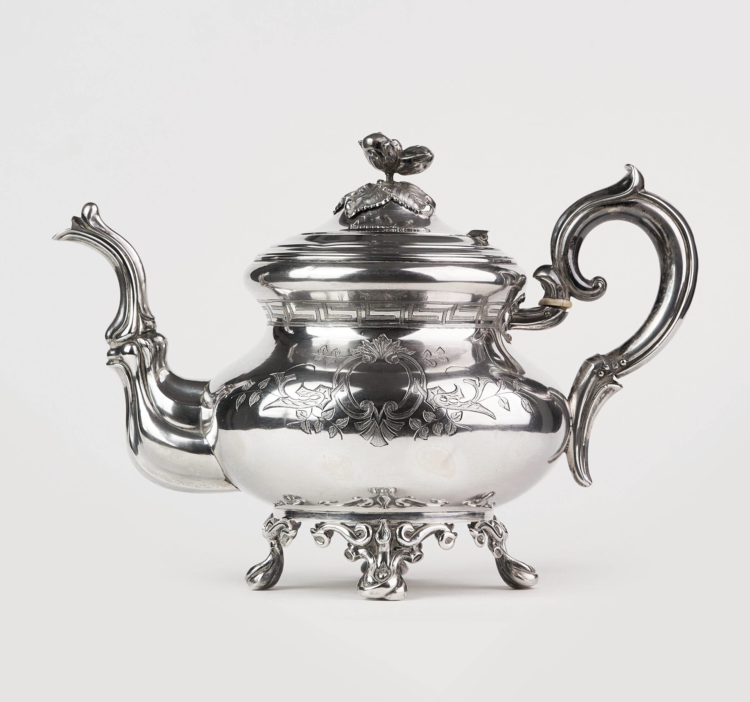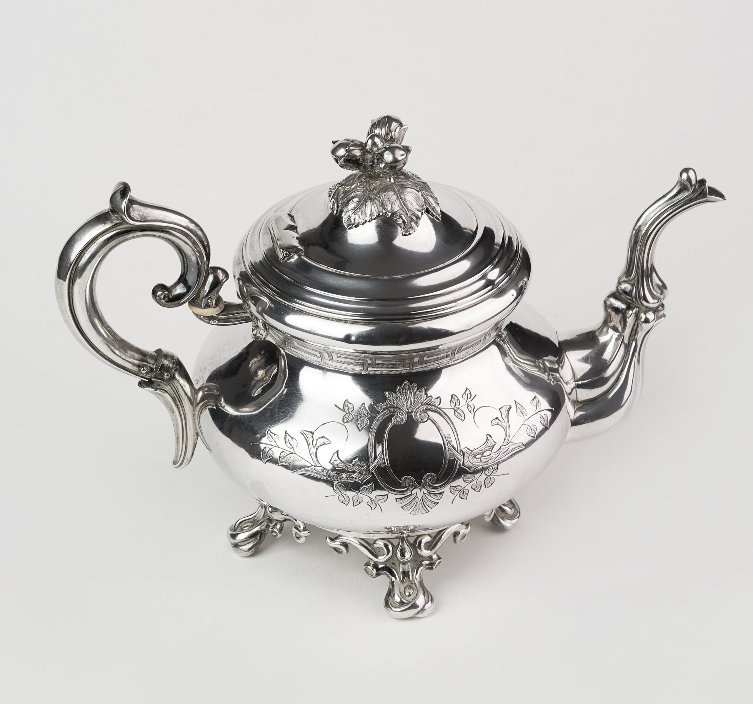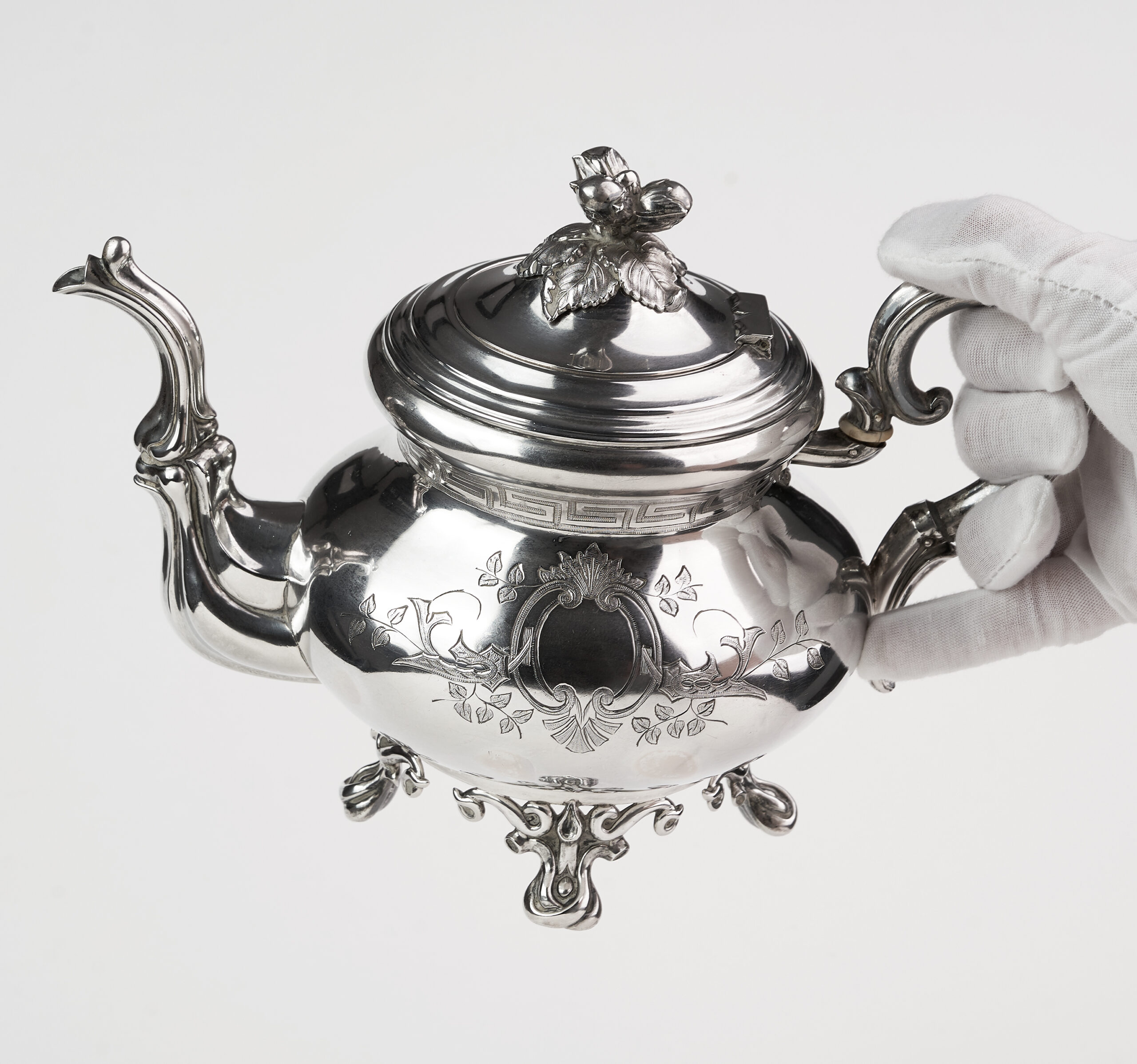 Capacul, perfect proporționat, este decorat cu un finial vegetal sculptat, iar gura de turnare, cu linie fluidă și elegant arcuită, reflectă măiestria atelierului care a realizat piesa. Toarta masivă, ergonomică și bogat profilată, păstrează coerența estetică a întregului ansamblu.