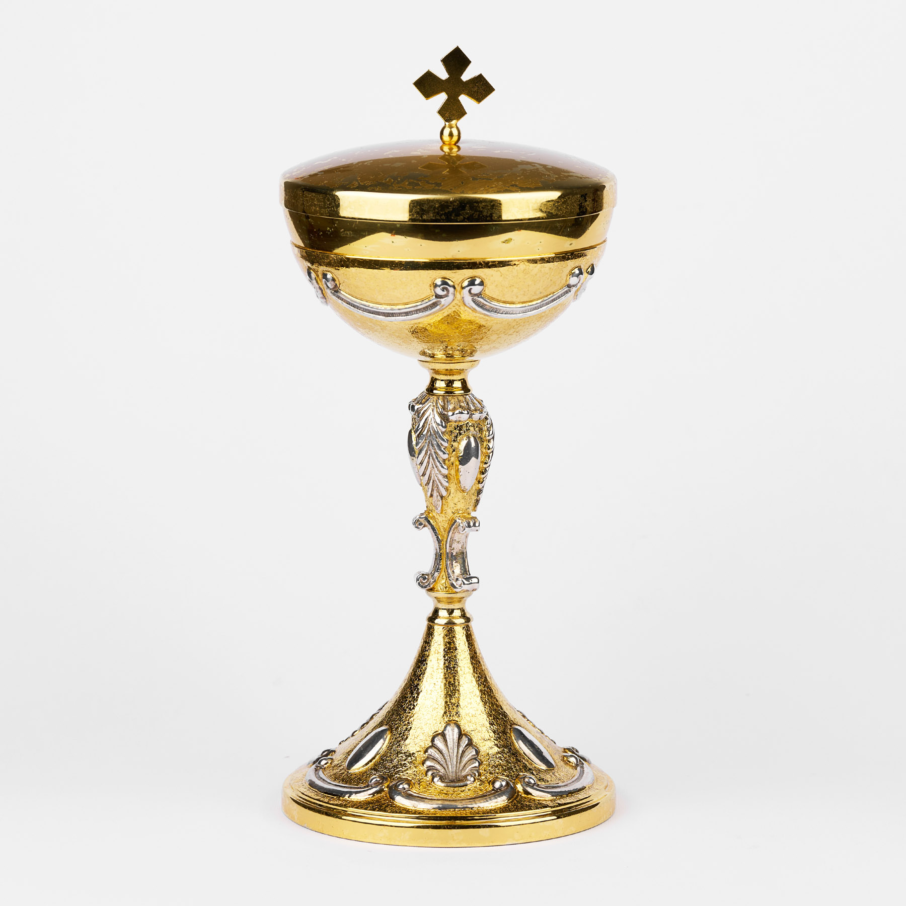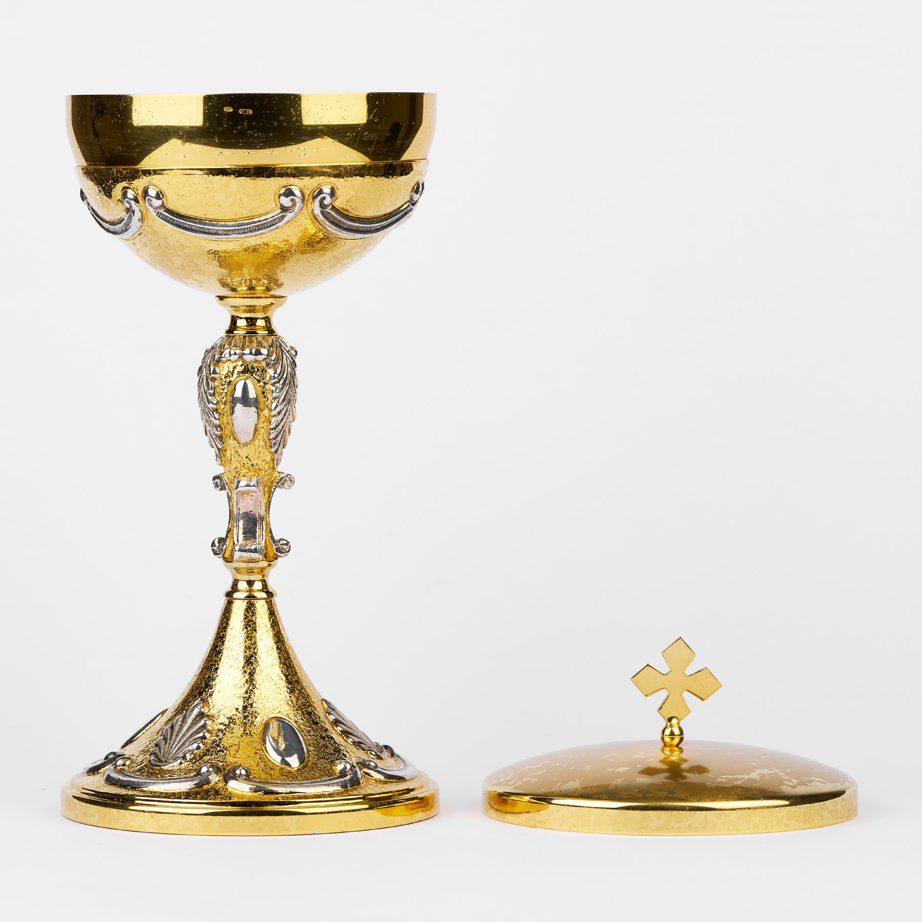 Cupă: realizată din argint masiv aurit, finisată lucios la interior, conform tradiției liturgice, pentru a proteja vinul euharistic.
