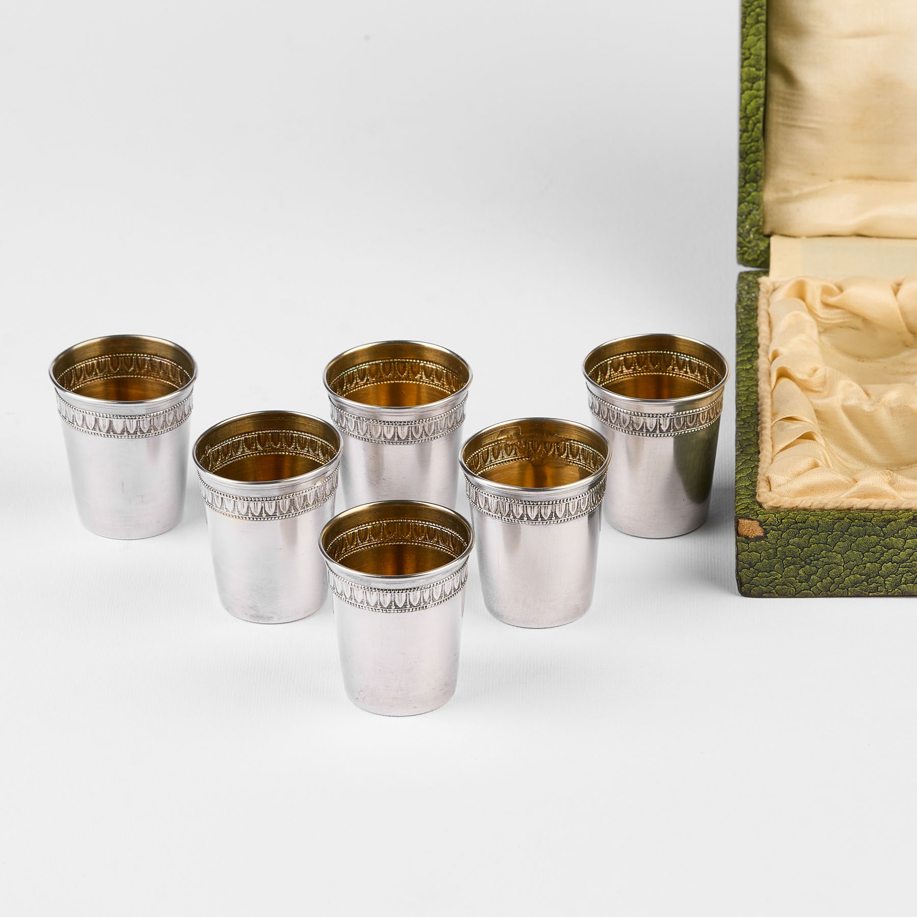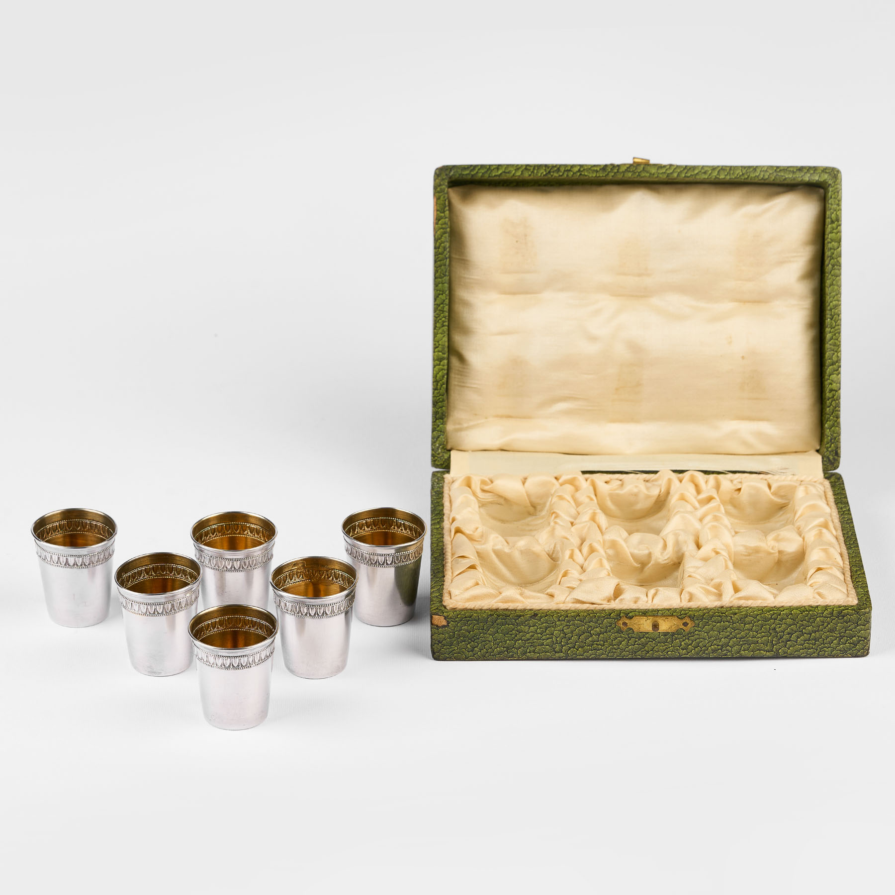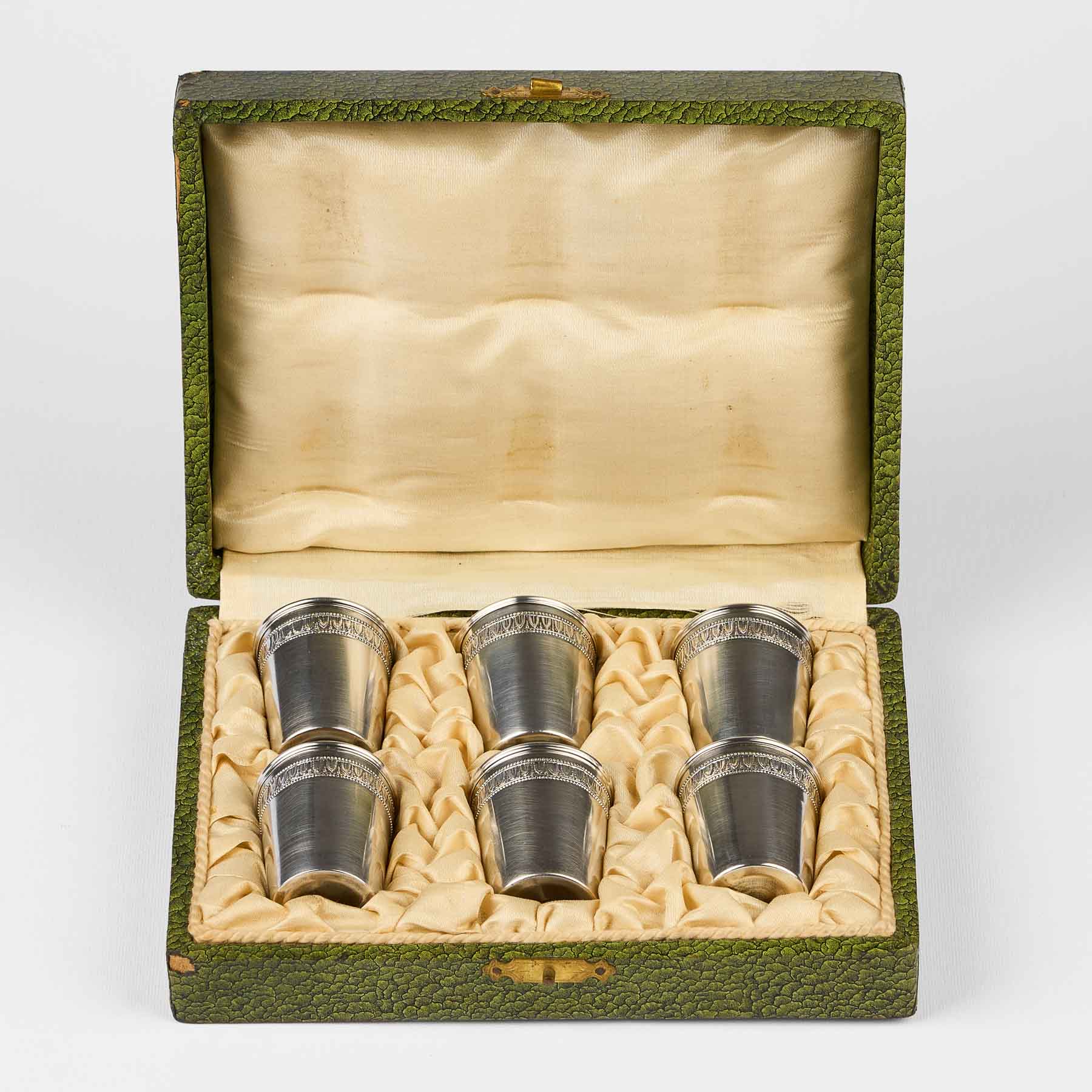 Set de 6 pahare pentru bauturi tari,din argint 950,in cutie-Franta cca 1900